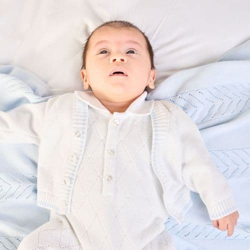 Original price £57.99Original price £57.99 - Original price £57.99Original price £57.99Current price £46.39£46.39 - £46.39Current price £46.39| /An adorable coordinating hat finishes off this comfy little baby boy’s knitted two-piece. The pale blue top features contrasting rows of white cheq...