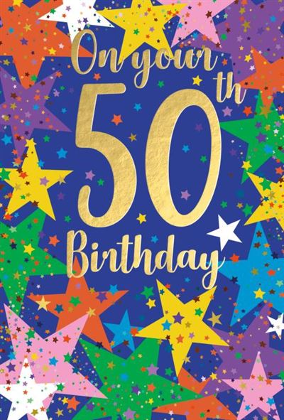 Original price £2.29 - Original price £2.29Original price£2.29£2.29 - £2.29Current price £2.29| /This sophisticated 50th birthday card from Nigel Quinney features a vibrant blue background adorned with multicoloured stars and a striking gold "5...