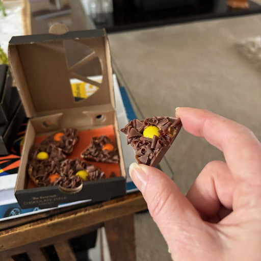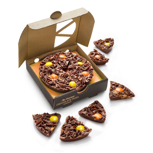 Chocolate pizzas are quirky, fun and utterly indulgent! Packaged in their very own pizza box, our chocolate pizza range consists of pizza-shaped chunks of chocolate, topped with everything from fudge and marshmallows to honeycomb and jelly beans. Just like a savoury pizza, chocolate pizzas come in all shapes and sizes including 10”, 7”, mini, and by the slice.