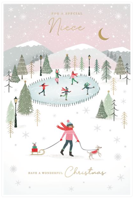Original price £2.50Original price £2.50 - Original price £2.50Original price £2.50Current price £1.50£1.50 - £1.50Current price £1.50| /This elegant Christmas card from Kingfisher Cards features a charming scene of people skating and a girl walking her dog, captur...