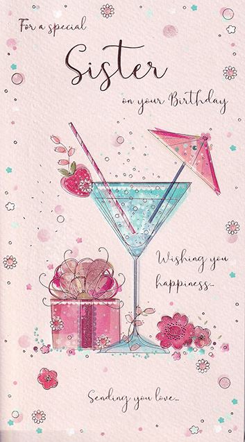 Celebrate your sister’s birthday with this sophisticated card featuring soft pink tones and an elegant design of cocktail glasses and presents. The...