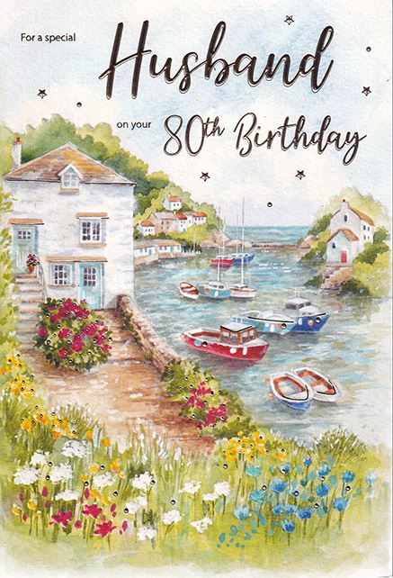 Original price £2.50 - Original price £2.50Original price£2.50£2.50 - £2.50Current price £2.50| /Celebrate your husband’s 80th birthday with this elegant card featuring a charming coastal cottage and boats design. The refined imagery evokes tra...