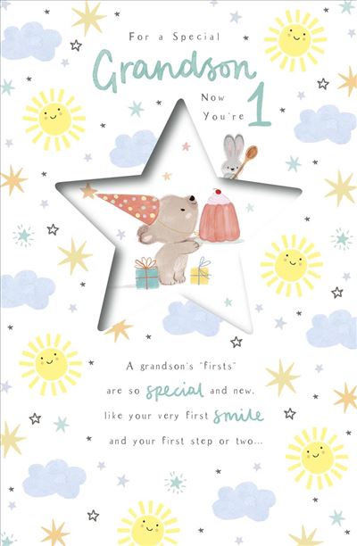 Original price £2.99 - Original price £2.99Original price£2.99£2.99 - £2.99Current price £2.99| /Celebrate your grandson’s birthday with this vibrant card in blue tones, adorned with a lively bear, sun and clouds motif and a thoughtful message....