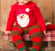 Festive red with Santa's face appliquéd on & a fluffy white beard.