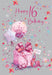 This sophisticated Cherry Orchard birthday card celebrates a 16th birthday with elegant pink tones, featuring beautifully wrapped presents and festive balloons. It’s a graceful way to mark this special milestone.