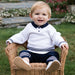A perfect new baby gift Stan, in navy, is a cute and comfy baby boy’s babygrow. The top half of the garment is in white with a smart collar detailed with a contrasting navy top-stitch. The lower part of the garment is a navy and white vertical stripe. Traditional embroideries of a drum, circus ball and number blocks make this a cute piece for baby boys.