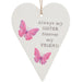 Celebrate the special bond with your sister using this playful stylish hanging heart plaque from the Daisyfield range. Featuring vibrant pink butterflies and the sweet message, “Always my sister, forever my friend,” it’s a cheerful way to brighten any space and show your love.