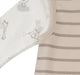 Charming two piece set featuring a long sleeve top adorned with giraffe and elephant motifs, fastened with back poppers for effortless dressing. The coordinating striped overall in stone tones includes integrated feet and shoulder and leg poppers for convenient nappy changes. Thoughtfully designed for active infants and toddlers, this set combines playful style with practical functionality. Soft, breath