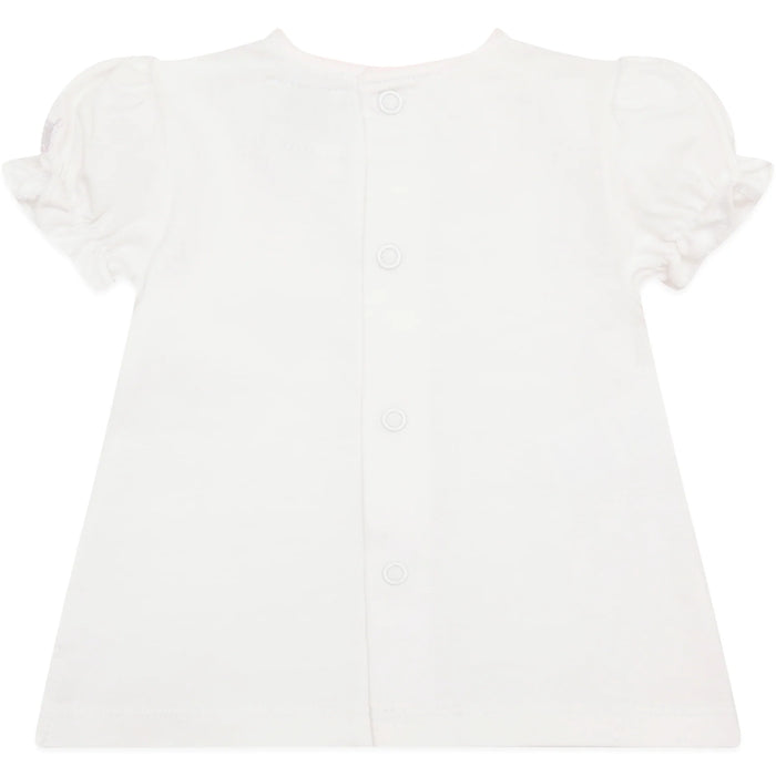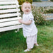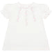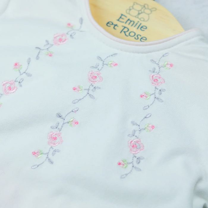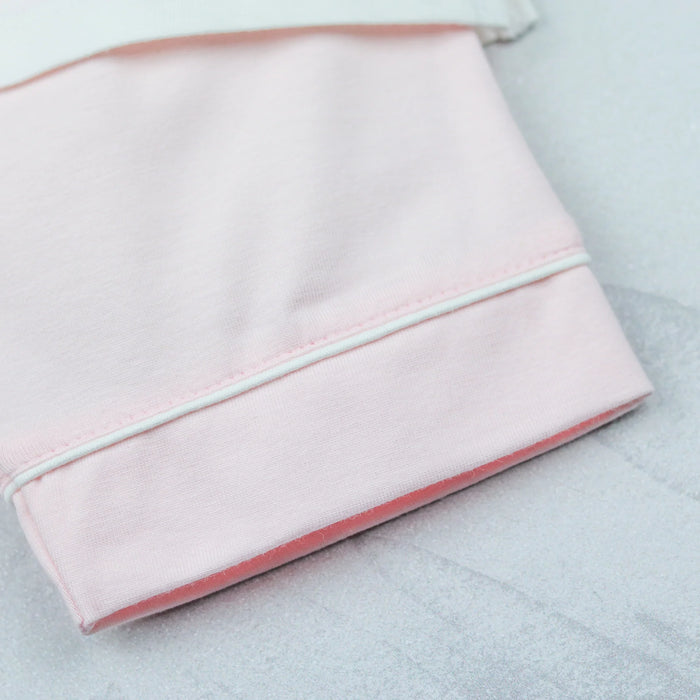 This delightful two piece top and shorts set is available in our signature pink or our new stone colourway. The white top has three simple but gorgeous cascading pink floral embroideries trailing from the neck. Ensuring a comfy fit this garment is slightly fuller in style with puffed gathered sleeves and slide. Coordinating pink shorts with white piping complete the set, great for a summer picnic.