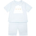 Jonnie is a classic, pale blue, boys two piece perfect for when something a little smarter is needed. The top has a white inset panel with precise horizontal pleats and gorgeous teddy head embroideries. Angled white piping runs from the blue collar to hemline. The top also has side splits and white piping to the sleeves and sweet little blue shorts with contrasting white leg piping. All very co-ordinated.