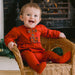 New for the party season in festive red, Kiki is a lovey cosy babygrow. Two striking large tartan bows and tartan panel are the stand out feature of this garment, which is all brought together with contrasting navy piping and little satin bows on each foot. A perfect outfit for any family celebration.
