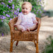 In the same all over floral print as Lacey, Lori is a beautiful baby girl’s romper. In shades of pink, lilac and grey, lace trim around the round neck, tiny pintuck pleats and little satin bows this is stunning addition to any little girls wardrobe. Perfect for a playdate picnic!