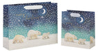 A beautiful Christmas gift bag, with an illustration of polar bears walking through the snow underneath a starry sky. The gift bag comes complete with ribbon handles and a gift tag.