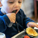 The fork has a nylon head for easy stabbing and the spoon has a soft narrow head for scooping and dipping. The set even has little bumps on the back of the handles to stop it from rolling off the table.