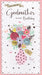Celebrate your godmother’s birthday with this elegant card featuring soft pastel tones and a delicate design of a vase of flowers accompanied by butterflies. The refined imagery conveys warmth and grace, making it a perfect choice to express your heartfelt wishes with sophistication.
