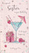 Celebrate your sister’s birthday with this sophisticated card featuring soft pink tones and an elegant design of cocktail glasses and presents. The refined imagery captures the festive spirit with grace, making it a perfect way to send your heartfelt wishes on her special day.
