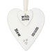 A lovely ceramic hanging heart in neutral tone, with the words 'New Mum' and three small hearts there is also a second smaller heart sitting over the top finished with the words 'With Love'. This all hangs on crisp white ribbon. The back in blank so an ideal space to write a special message.