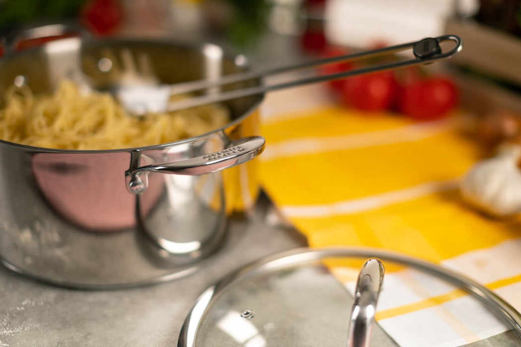 The comfortable stainless steel loop handles are riveted to the pot and will stay cool when used on the hob (provided flames are not licking up the sides). The glass lid has a convenient steam hole so that you can see what is happening inside the pot without losing heat by lifting the lid.