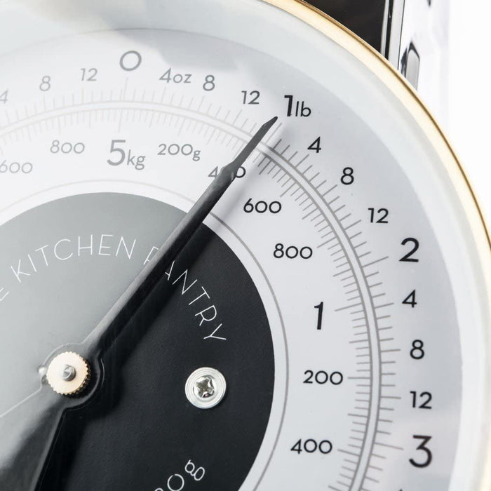 The Kitchen Pantry mechanical scales are designed to combine functionality with a nod to the scales of times past. The easy to read dial increases in increments of 20g / 1oz and the scales contain an adjustment dial to ensure they remain accurate for many years to come. Designed to help you bake, make and create - the Kitchen Pantry collection is a complete range for everything you need to create you own home made products. We have selected a range of brass, wood, glass and marble finishes to evoke memories of times past, while adding contemporary twists to make the range look at home in your kitchen today. The range is accented with honeycomb pattern embossed ceramics, brass detailed stainless steel utensils, double sided carved acacia wood chopping boards and marble serve ware, so you can refresh your whole kitchenware collection or just update your collection with a few new pieces. This timeless mechanical kitchen scale is the perfect centrepiece for your Kitchen. Contrasting black and brass finishes transform this everyday essential into an eye-catching kitchen centrepiece.