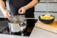 Perfect for use on all heat sources including induction, this fryer and basket features an integrated pan rest holder on the chip basket, great for allowing the fat to drain from the chips once sufficiently fried! Other features include a vented lid with phenolic knob, a long phenolic handle and a phenolic side handle for safe and durable use.