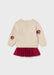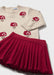 This refined girls’ outfit pairs a cream jumper adorned with a charming mushroom detailing with a vibrant red pleated skirt. The sophisticated combination offers a stylish and playful look perfect for any occasion.