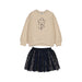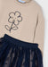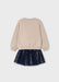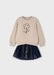 This sophisticated Mayoral girls' set includes a crisp white top adorned with a delicate floral appliqué, paired with a vibrant dark ruffled skirt. The combination offers a refined and charming outfit perfect for special occasions or stylish everyday wear.