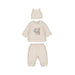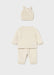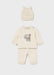 This Mayoral newborn boy’s three-piece corduroy set includes cream joggers, a cream top featuring an elephant design, and a matching cream hat with bear ears. Crafted for softness and warmth, this coordinated outfit combines playful details with practical comfort for your little one.