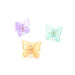 These Molly & Rose butterfly mini clamps measure 2.5cm and feature an iridescent plastic finish for a subtle shimmer. Available in two colourways, each unit includes four clamps displayed on a card. Ideal for securely styling small sections of hair with a delicate, decorative touch.