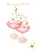 This pretty card features a charming illustrations from Nigel Quiney depicting a pair of glasses filled with wine with vibrant gold hearts. The words 'Anniversary Wishes' are written across the card. Paired with a stylish envelope, they bring happiness to every special occasion.