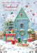 The Nigel Quiney Christmas card features a sophisticated festive image of a small shed adorned with seasonal decorations, accompanied by a red sled outside. This elegant design is perfect for sending warm and refined holiday wishes to a husband.