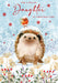 The Nigel Quiney Christmas card features a sophisticated festive image of a happy-looking hedgehog accompanied by a robin in a wintery woodland setting. This elegant design is perfect for sending warm and refined holiday wishes to a Daughter.