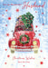 The Nigel Quiney Christmas card features a sophisticated festive image of a couple driving a red VW Beetle, carrying presents and a Christmas tree on the roof. This elegant design is perfect for sending warm and refined holiday wishes to a wonderful husband.