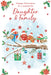 The Nigel Quiney Christmas card features a sophisticated festive image of a whimsical group of robins dressed in festive attire, gathered around a beautifully decorated tree. This elegant design is perfect for sending warm and refined holiday wishes to a Daughter and her family.