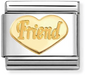 Experience the luxurious beauty of the Nomination Classic Gold Charm Crafted with 18K gold and stainless steel, this beautiful charm from the Friendship range is a perfect gift for your wife. It features a simple but elegant gold heart adorned with the word 'Friend' in a stylish font. It's the perfect way to show your BFF how much they mean to you.
