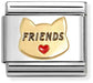 This Nomination classic gold charm features a sleek gold cat silhouette accented with a red enamel heart-shaped nose and the word "friends" in deep black lettering. Expertly designed, it symbolizes companionship and affection, making it a sophisticated and heartfelt addition to your jewelry collection.