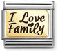 This Nomination classic gold charm features deep black lettering spelling out "I love family," making it an ideal gift to express affection for a loved one. Its elegant design combines meaningful sentiment with timeless style, perfect for celebrating close bonds and cherished relationships.