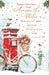This refined Christmas card from Nigel Quiney depicts a postman’s decorated bike leaning against a post box in a snowy scene. With a heartfelt "from across the miles" message, it elegantly conveys warm festive wishes despite the distance.