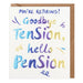 This everyday occasion themed card from Paperlink features a beautiful, high quality artistic design depicting a vibrant card and colourful card with the words 'You're retiring! goodbye tension hello pension'.