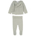 This Rock a Bye Boutique two-piece set includes a delicate frilled neck wrap top paired with matching sage trousers featuring enclosed feet, designed for comfort and warmth. Available in sizes 0-3, 3-6, and 6-12 months, this coordinated outfit provides a cozy fit that supports your baby’s natural movement while ensuring a stylish look for everyday wear.