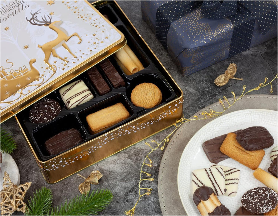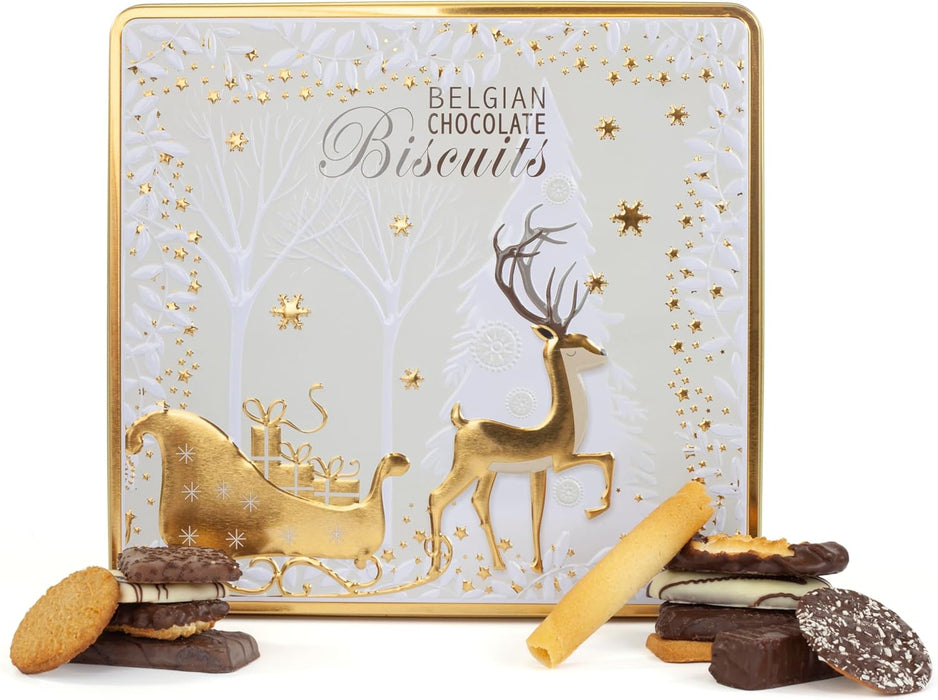 Silver Crane Co Gold & White Reindeer Belgian Chocolate Christmas Biscuits Tin
