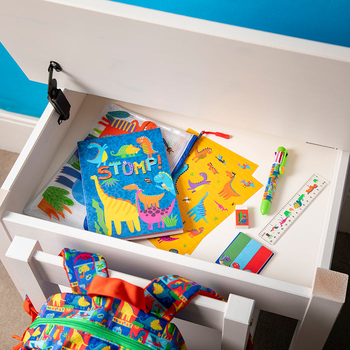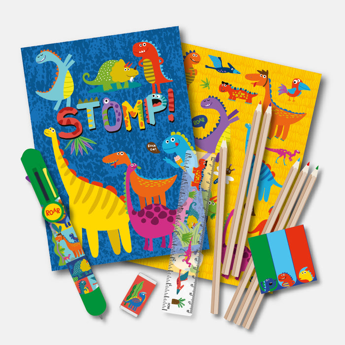 A complete stationery set for little creatives’ writing and drawing needs. A cute reusable, zipped pocket contains an A5 notebook with 96 pages, 2 sticker sheets, a pad of sticky notes, a rainbow pen, 6 full length-coloured pencils, eraser and ruler!