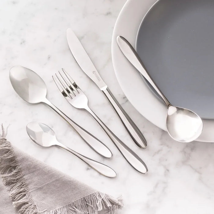 This flatware cutlery set is enviably stylish with a handle design that gently flows to form a classic teardrop shape. The 16 piece set is expertly balanced with slender, smooth, rounded handles and elegant curves .