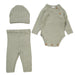 This True Knit Cotton Set in sage features a beautifully crafted cable knit pattern, combining style and comfort for your baby. The set includes a body suit with convenient button fastening, a matching hat, and ribbed leggings, ensuring a cozy and coordinated outfit. Available in sizes 0-3, 3-6, and 6-12 months, it is designed with soft, breathable cotton to keep delicate skin comfortable while providing warmth and flexibility.