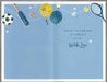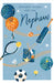 This sophisticated birthday card from UK Greetings features cool blue tones and sports equipment imagery, thoughtfully designed to celebrate a nephew’s special day with style and enthusiasm.