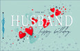 This UK Greetings birthday card for your husband features elegant blue tones accented with vibrant red hearts, creating a sophisticated and heartfelt design perfect for celebrating his special day.