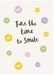 This elegant UK Greetings open card features a charming array of smiley faces in soft pastel tones, paired with the thoughtful message "Take the time to smile." Its sophisticated design makes it a versatile and heartfelt choice suitable for any occasion, encouraging warmth and positivity.