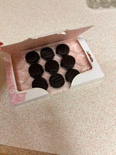 Ingredients: Fondant 63.6% (sugar, glucose syrup, water), Dark Chocolate 36% (cocoa mass, sugar, cocoa butter, emulsifier: soya lecithin), Strawberry Flavour, Colour: beetroot extract, Stabiliser: invertase.