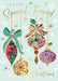 This Christmas card from Words n Wishes features vibrant hanging baubles set against a refined pastel and gold-toned background. Its elegant design provides a sophisticated way to send warm holiday wishes to a friend.