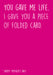 - Front Reads: You gave me life I gave you a piece of folded card