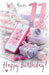 Celebrate an 11-year-old girl’s birthday with this playful card from Words & Wishes. Featuring colorful presents, a watch, and a mobile phone, it’s a fun way to send joyful wishes and make her special day even brighter.